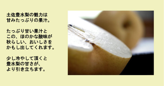土佐豊水梨(ほうすい) 土佐 豊水梨 (08-122) ありがとうございました 「土佐豊水(ほうすい)梨」。 2024年度、販売終了いたしました。 秋薫る、土佐の旬果「豊水梨」 豊水梨は、日本を代表する梨の一つでもあります。 豊かな果汁と、シャリ感のある果肉で、根強い人気の 「土佐 豊水梨」。 新高梨も、待ち遠しい時期ですが、 やっぱり豊水の人気は衰えませんね。 是非ご賞味下さい。 注文番号タイトル販売価格(税込)在庫状態数量単位 08-120-604土佐 豊水梨6~8玉¥5,000売り切れ約4㎏売り切れ08-120-302土佐 豊水梨3玉¥3,300売り切れ約2㎏売り切れ08-120-191土佐豊水梨・シャインマスカットセット¥5,000売り切れ売り切れ